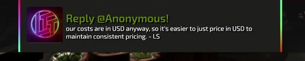 Reply @Anonymous! our costs are in USD anyway, so it's easier to just price in USD to maintain consistent pricing. - LS
