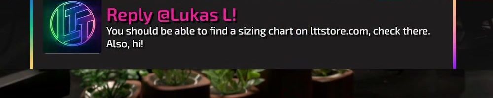 Reply @Lukas L! You should be able to find a sizing chart on lttstore.com, check there. Also, hi!