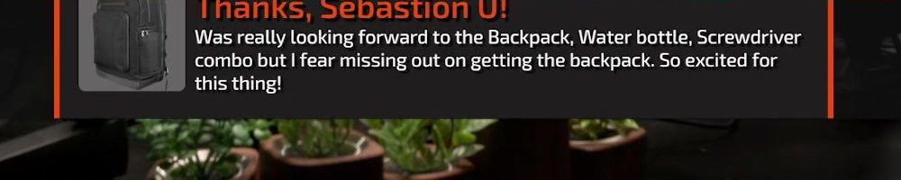 Thanks, Sebastian U! Was really looking forward to the Backpack, Water bottle, Screwdriver combo but I fear missing out on getting the backpack. So excited for this thing!