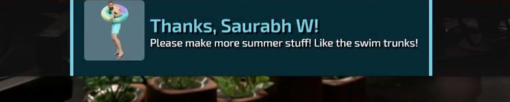 Thanks, Saurabh W! Please make more summer stuff! Like the swim trunks!