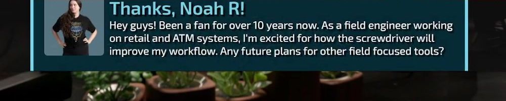 Thanks, Noah R! Hey guys! Been a fan for over 10 years now. As a field engineer working on retail and ATM systems, I'm excited for how the screwdriver will improve my workflow. Any future plans for other field focused tools?