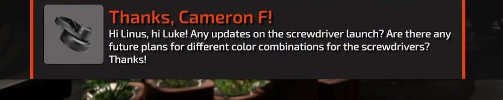 Thanks, Cameron F! Hi Linus, hi Luke! Any updates on the screwdriver launch? Are there any future plans for different color combinations for the screwdrivers? Thanks!
