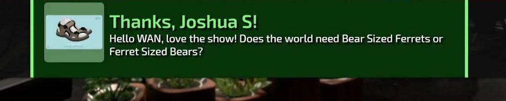 Thanks, Joshua S! Hello WAN, love the show! Does the world need Bear Sized Ferrets or Ferret Sized Bears?
