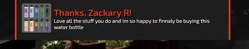 Thanks, Zackary R! Love all the stuff you do and Im so happy to finnaly be buying this water bottle