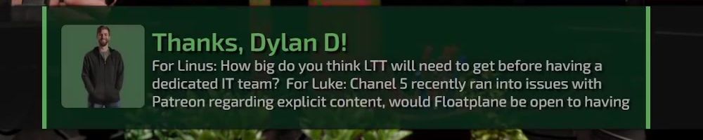 For Linus: How big do you think LTT will need to get before having a dedicated IT team? For Luke: Chanel 5 recently ran into issues with Patreon regarding explicit content, would Floatplane be open to having
