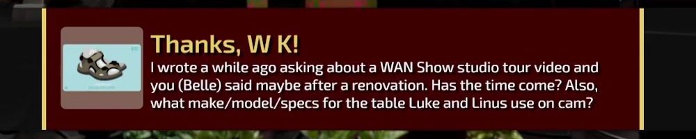 I wrote a while ago asking about a WAN Show studio tour video and you (Belle) said maybe after a renovation. Has the time come? Also, what make/model/specs for the table Luke and Linus use on cam?