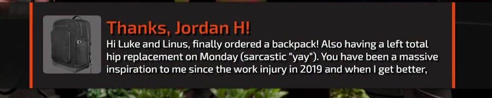 Hi Luke and Linus, finally ordered a backpack! Also having a left total hip replacement on Monday (sarcastic "yay"). You have been a massive inspiration to me since the work injury in 2019 and when I get better,