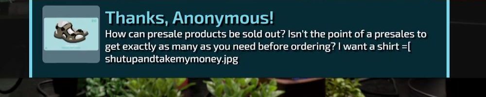 How can presale products be sold out? Isn't the point of a presales to get exactly as many as you need before ordering? I want a shirt =[ shutupandtakemymoney.jpg