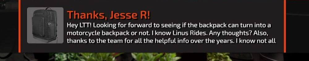 Hey LTT! Looking for forward to seeing if the backpack can turn into a motorcycle backpack or not. I know Linus Rides. Any thoughts? Also, thanks to the team for all the helpful info over the years. I know not all