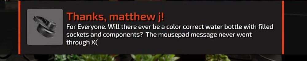 For Everyone. Will there ever be a color correct water bottle with filled sockets and components? The mousepad message never went through X(