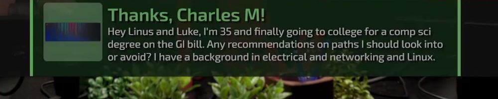 Hey Linus and Luke, I'm 35 and finally going to college for a comp sci degree on the Gl bill. Any recommendations on paths I should look into or avoid? I have a background in electrical and networking and Linux.