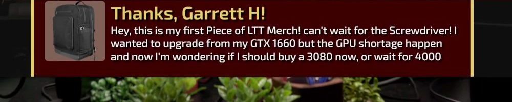 Hey, this is my first Piece of LTT Merch! can't wait for the Screwdriver! I wanted to upgrade from my GTX 1660 but the GPU shortage happen and now I'm wondering if I should buy a 3080 now, or wait for 4000