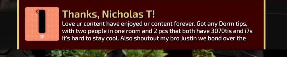 Love ur content have enjoyed ur content forever. Got any Dorm tips, with two people in one room and 2 pcs that both have 3070tis and i7s it's hard to stay cool. Also shoutout my bro Justin we bond over the