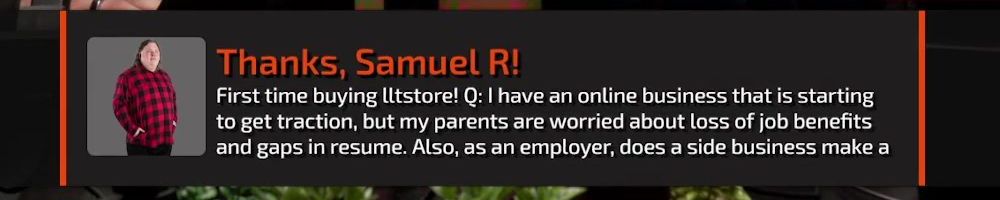 First time buying lltstore! Q: I have an online business that is starting to get traction, but my parents are worried about loss of job benefits and gaps in resume. Also, as an employer, does a side business make a