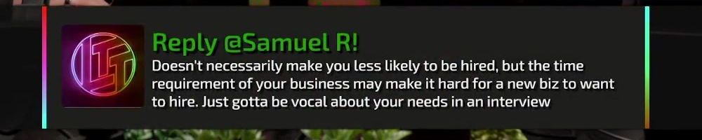 Doesn't necessarily make you less likely to be hired, but the time requirement of your business may make it hard for a new biz to want to hire. Just gotta be vocal about your needs in an interview