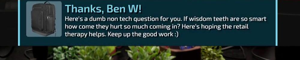Here's a dumb non tech question for you. If wisdom teeth are so smart how come they hurt so much coming in? Here's hoping the retail therapy helps. Keep up the good work :)