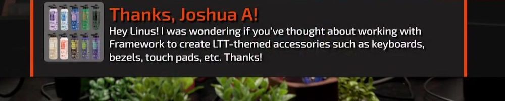 Hey Linus! I was wondering if you've thought about working with Framework to create LTT-themed accessories such as keyboards, bezels, touch pads, etc. Thanks!