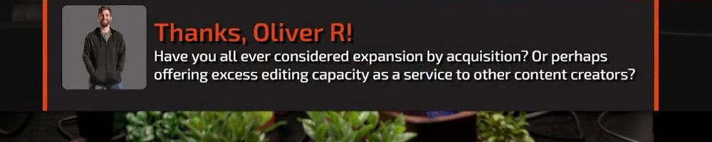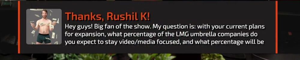 Hey guys! Big fan of the show. My question is: with your current plans for expansion, what percentage of the LMG umbrella companies do you expect to stay video/media focused, and what percentage will be