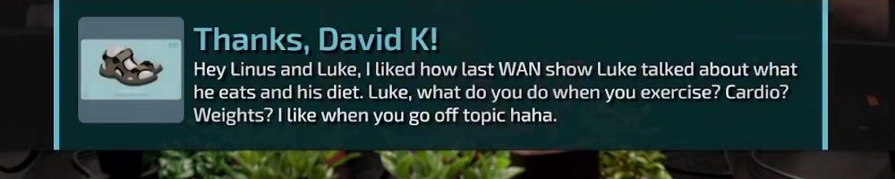 Hey Linus and Luke, I liked how last WAN show Luke talked about what he eats and his diet. Luke, what do you do when you exercise? Cardio? Weights? I like when you go off topic haha.