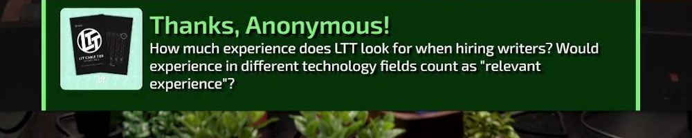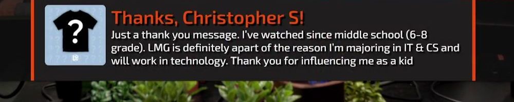 Just a thank you message. I've watched since middle school (6-8 grade). LMG is definitely apart of the reason I'm majoring in IT & CS and will work in technology. Thank you for influencing me as a kid