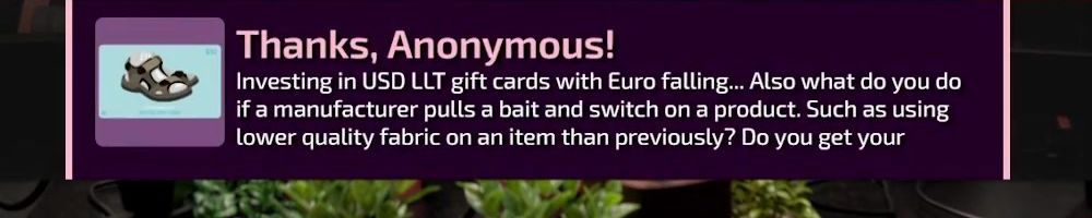 Investing in USD LLT gift cards with Euro falling... Also what do you do if a manufacturer pulls a bait and switch on a product. Such as using lower quality fabric on an item than previously? Do you get your