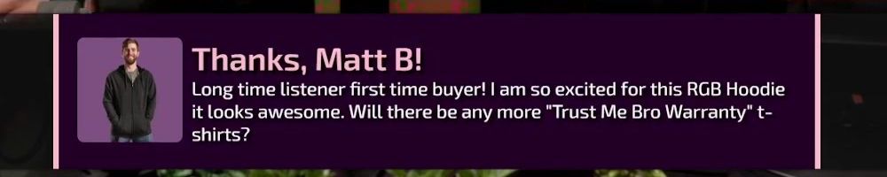 Long time listener first time buyer! I am so excited for this RGB Hoodie it looks awesome. Will there be any more "Trust Me Bro Warranty" t-shirts?