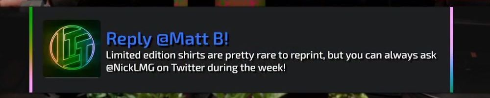 Any updates on when the Multi Nep shirt will be restocked? Also shout out to all the behind the camera staff LTT has, especially editors and designers!!