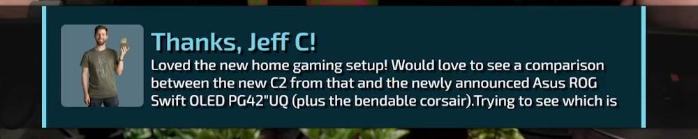 Loved the new home gaming setup! Would love to see a comparison between the new C2 from that and the newly announced Asus ROG Swift OLED PG42"UQ (plus the bendable corsair).Trying to see which is