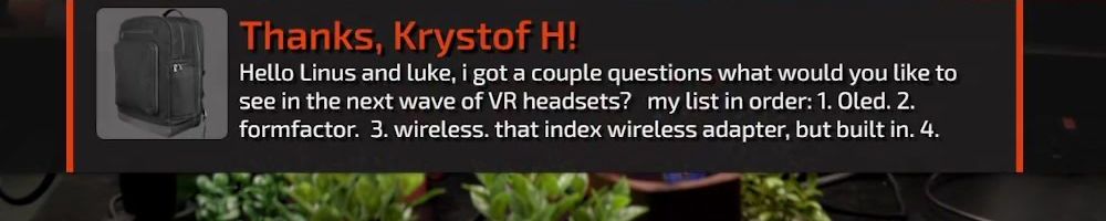 Hello Linus and luke, i got a couple questions what would you like to see in the next wave of VR headsets? my list in order: 1. Oled. 2. formfactor. 3. wireless. that index wireless adapter, but built in. 4.