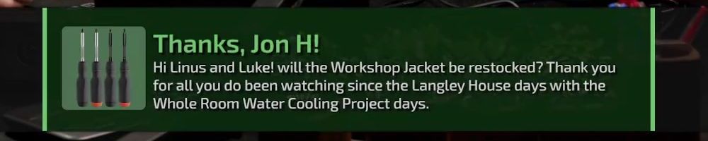 Thanks, Jon H! Hi Linus and Luke! will the Workshop Jacket be restocked? Thank you for all you do been watching since the Langley House days with the Whole Room Water Cooling Project days.