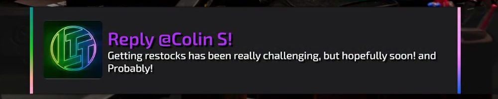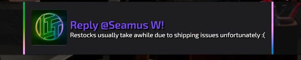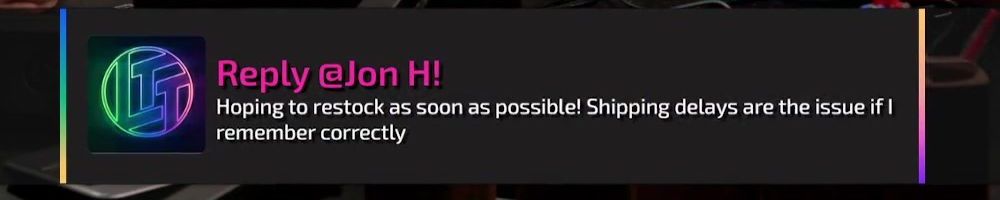 Reply @Jon H! Hoping to restock as soon as possible! Shipping delays are the issue if I remember correctly