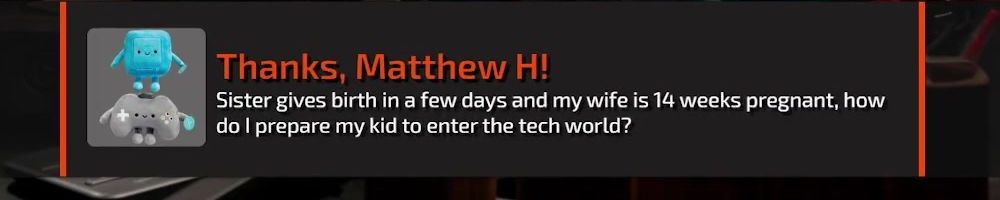 Thanks, Matthew H! Sister gives birth in a few days and my wife is 14 weeks pregnant, how do I prepare my kid to enter the tech world?