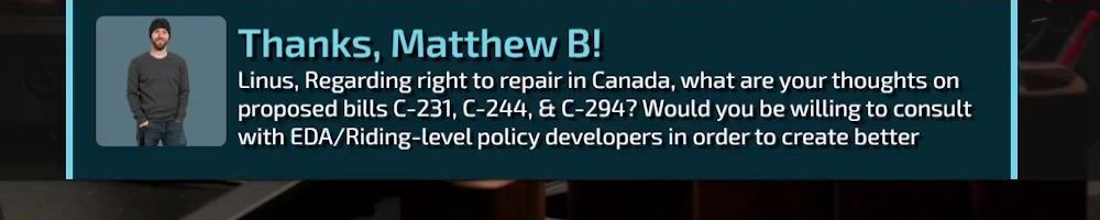 Thanks, Matthew B! Linus, Regarding right to repair in Canada, what are your thoughts on proposed bills C-231, C-244, & C-294? Would you be willing to consult with EDA/Riding-level policy developers in order to create better