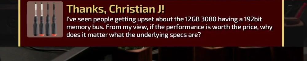 Thanks, Christian J! I've seen people getting upset about the 12GB 3080 having a 192bit memory bus. From my view, if the performance is worth the price, why does it matter what the underlying specs are?
