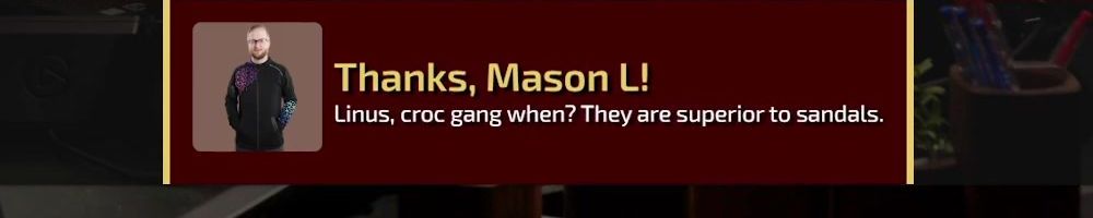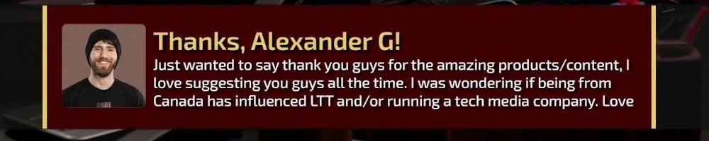 Thanks, Alexander G! Just wanted to say thank you guys for the amazing products/content, I love suggesting you guys all the time. I was wondering if being from Canada has influenced LTT and/or running a tech media company. Love