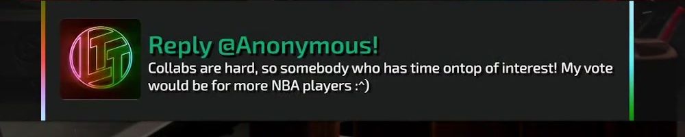 Reply @Anonymous! Collabs are hard, so somebody who has time ontop of interest! My vote would be for more NBA players :*)