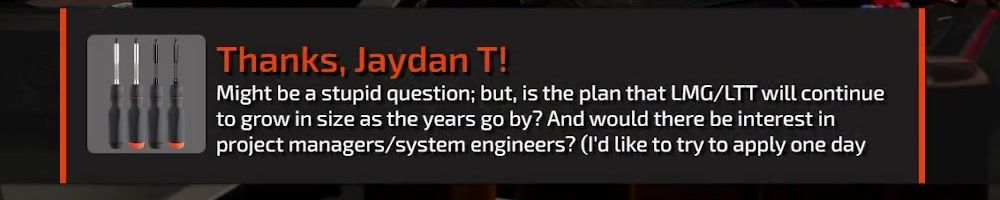 Thanks, Jaydan T! Might be a stupid question; but, is the plan that LMG/LTT will continue to grow in size as the years go by? And would there be interest in project managers/system engineers? (I'd like to try to apply one day