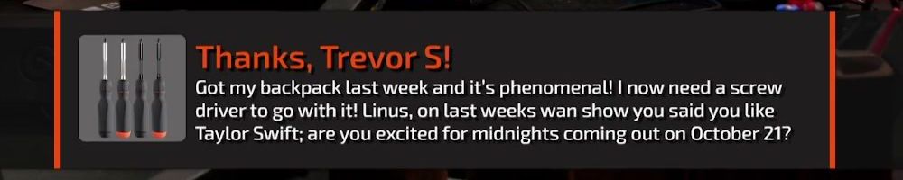 Thanks, Trevor S! Got my backpack last week and it's phenomenal! I now need a screw driver to go with it! Linus, on last weeks wan show you said you like Taylor Swift; are you excited for midnights coming out on October 21?