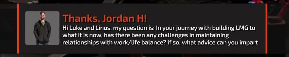 Thanks, Jordan H! Hi Luke and Linus, my question is: In your journey with building LMG to what it is now, has there been any challenges in maintaining relationships with work/life balance? if so, what advice can you impart