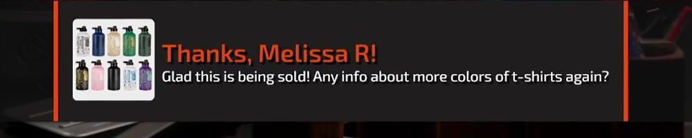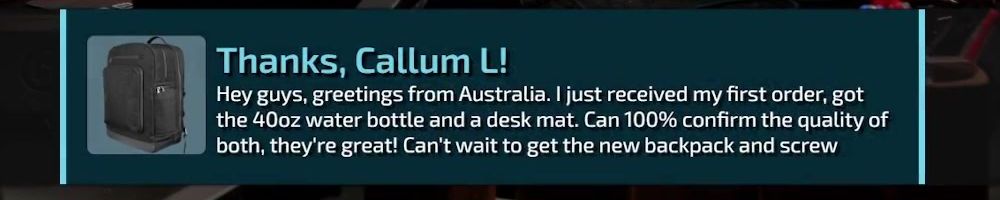 Thanks, Callum L! Hey guys, greetings from Australia. I just received my first order, got the 40oz water bottle and a desk mat. Can 100% confirm the quality of both, they're great! Can't wait to get the new backpack and screw