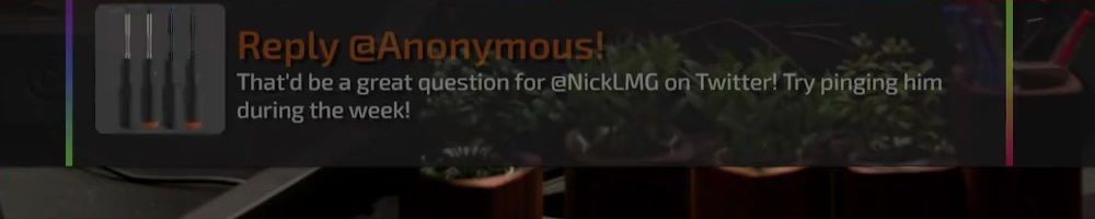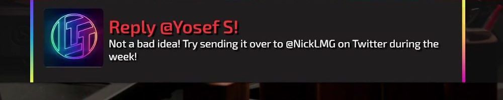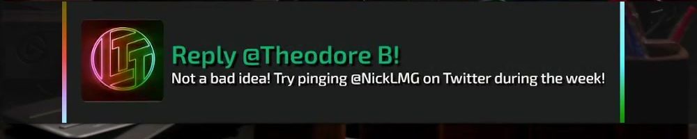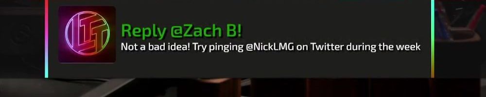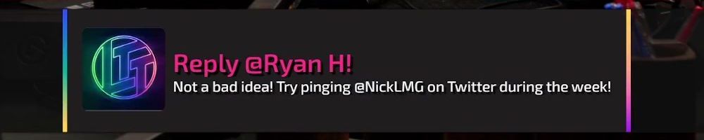 Reply @Zach B! Not a bad idea! Try pinging @NickLMG on Twitter during the week
