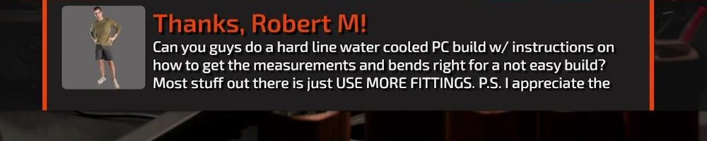 Thanks, Robert M! Can you guys do a hard line water cooled PC build w/ instructions on how to get the measurements and bends right for a not easy build? Most stuff out there is just USE MORE FITTINGS. P.S. I appreciate the