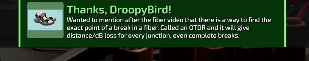 Thanks, DroopyBird! Wanted to mention after the fiber video that there is a way to find the exact point of a break in a fiber. Called an OTDR and it will give distance/dB loss for every junction, even complete breaks.