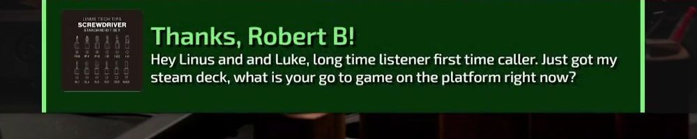 Thanks, Robert B! Hey Linus and and Luke, long time listener first time caller. Just got my steam deck, what is your go to game on the platform right now?