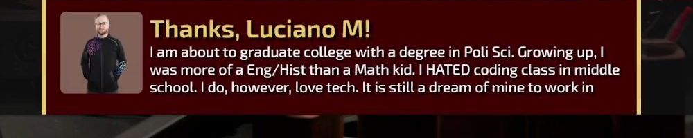 Thanks, Luciano M! I am about to graduate college with a degree in Poli Sci. Growing up, I was more of a Eng/Hist than a Math kid. I HATED coding class in middle school. I do, however, love tech. It is still a dream of mine to work in