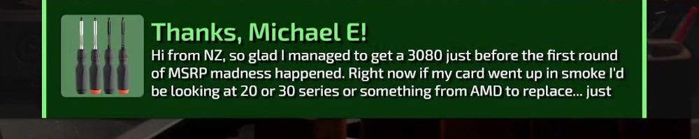 Thanks, Michael E! Hi from NZ, so glad I managed to get a 3080 just before the first round of MSRP madness happened. Right now if my card went up in smoke I'd be looking at 20 or 30 series or something from AMD to replace... just