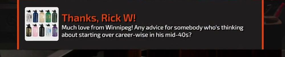Thanks, Rick W! Much love from Winnipeg! Any advice for somebody who's thinking about starting over career-wise in his mid-40s?