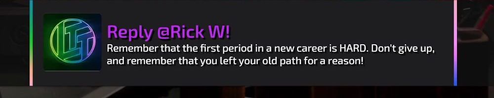 Reply @Rick W! Remember that the first period in a new career is HARD. Don't give up, and remember that you left your old path for a reason!
