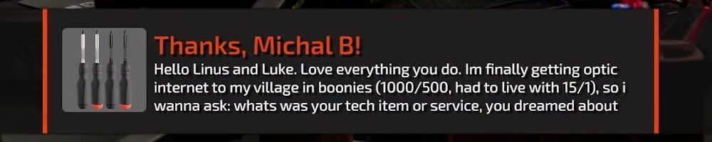 Thanks, Michal B! Hello Linus and Luke. Love everything you do. Im finally getting optic internet to my village in boonies (1000/500, had to live with 15/1), so i wanna ask: whats was your tech item or service, you dreamed about