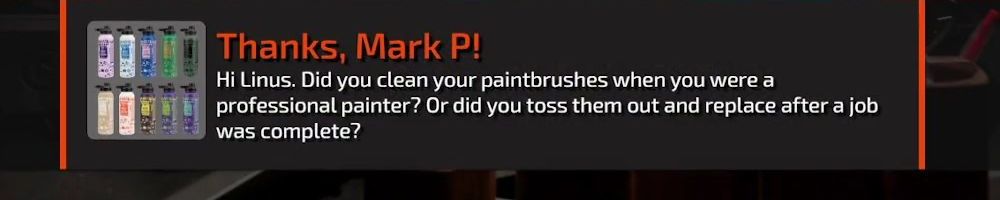 Thanks, Mark P! Hi Linus. Did you clean your paintbrushes when you were a professional painter? Or did you toss them out and replace after a job was complete?